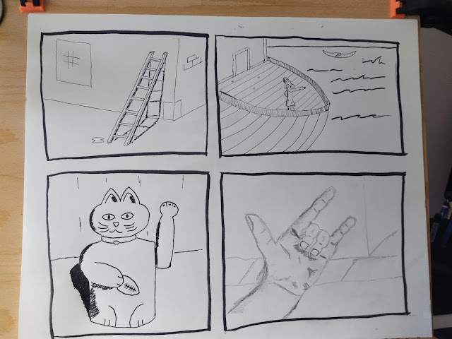 The prompt was to illustrate a symbol of bad luck, a symbol of good luck, a personal good luck charm, and an item or method to curse someone else with bad luck. This exercise wasn't particularly sequential, but focused on drawing, so I tried some different approaches.